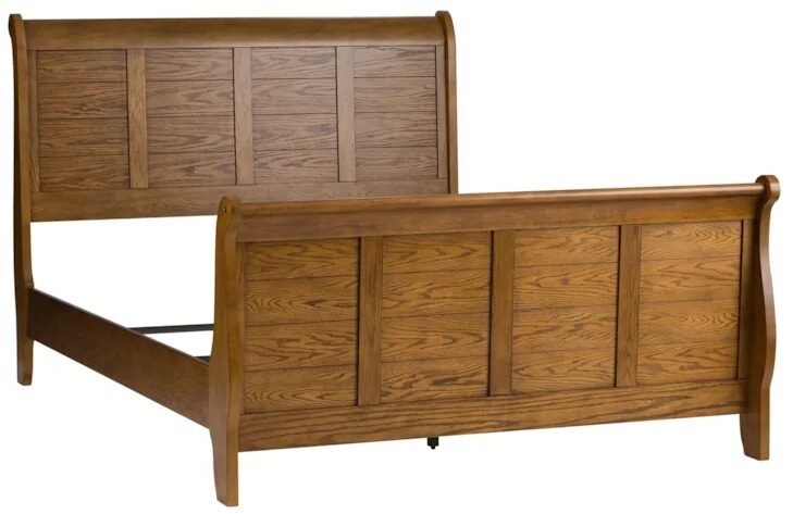 Staple any room with this rustic American style sleigh bed. Constructed with select hardwoods and ash and oak veneers, this piece features an aged oak finish, center slat supports, and a bolt on rail system. With wood and peg accents, this bed is sure to bring uniqueness and functionality to any room, allowing for a craftsman feel.